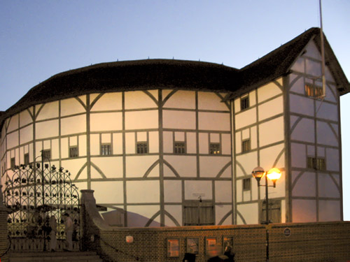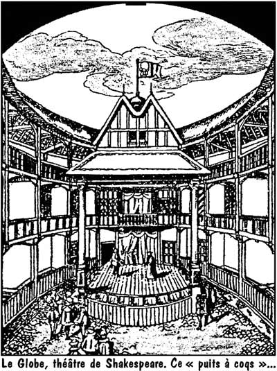 Les théâtres étaient construits en bois, tel le Globe, construit en 1594 au bord de la Tamise. Ils sont de forme circulaire ou polygonale ; au centre on trouve un espace vide C'est dans ce théâtre que la plupart des pièces de Shakespeare furent jouées. Mais en 1613, au cours de la représentation d' Henry VIII, les canonniers chargés de tirer les coups de canon (placés sous le toit) pour saluer le roi, n'ont pas prêté attention aux étincelles et le feu ravagea le théâtre, sans pour autant faire de victimes. Il fut alors reconstruit mais le chaume du toit fut remplacé par des tuiles.