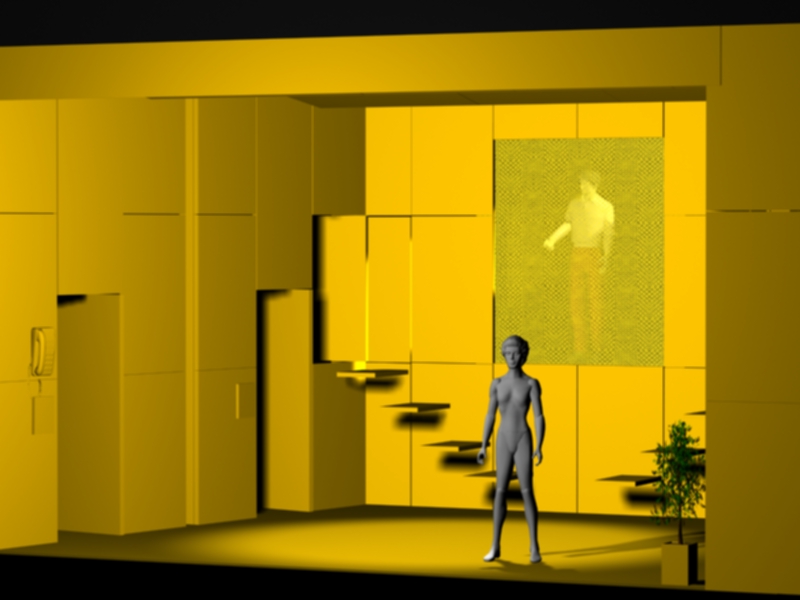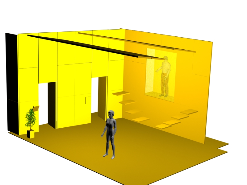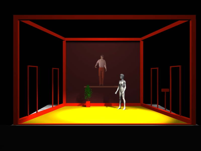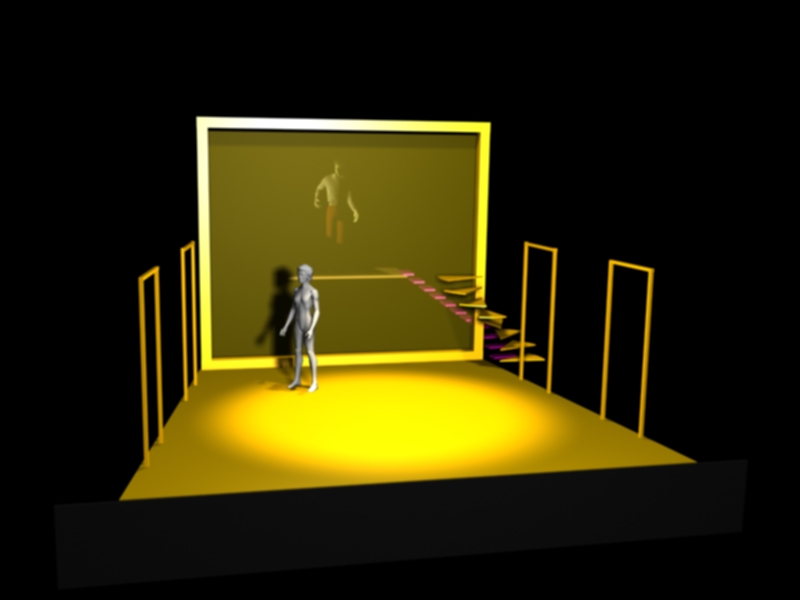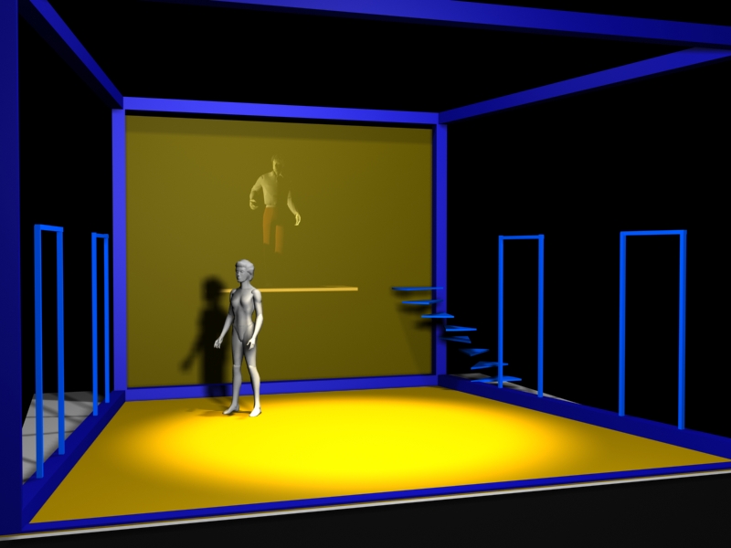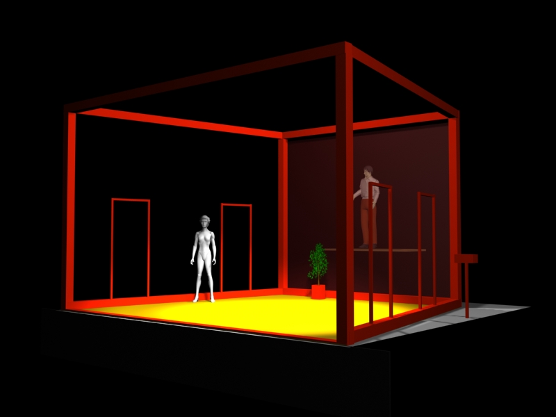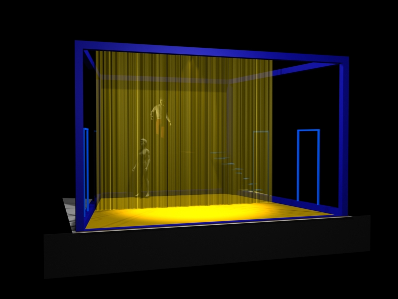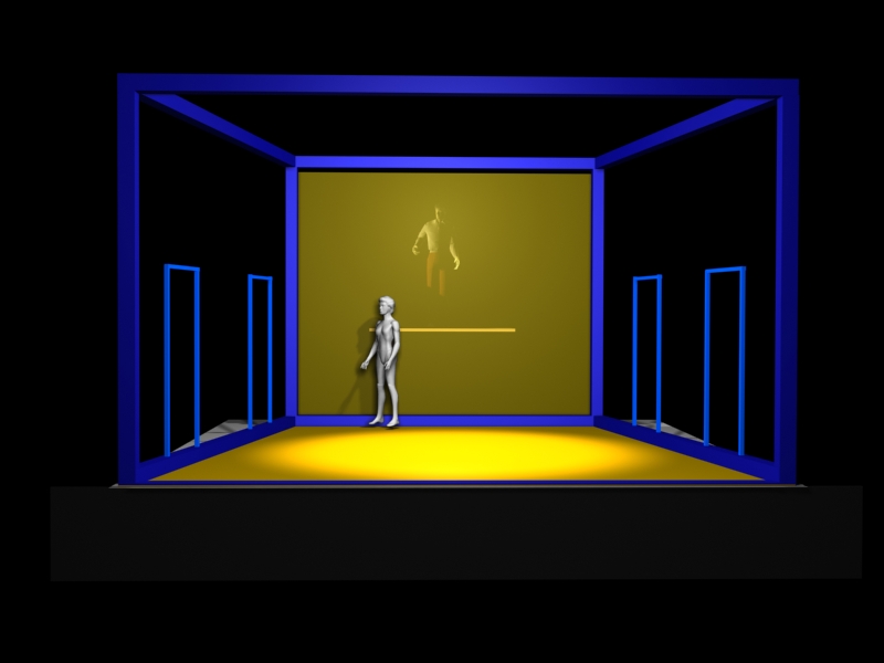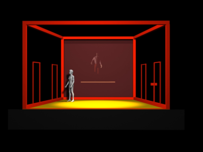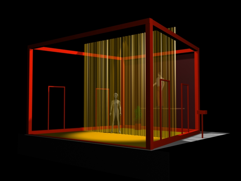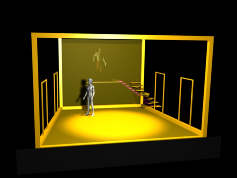 La problématique était de concevoir une boite servant d'espace de jeu avec 4 portes ouvertes sur un univers propre à chaque personnage, la boite doit intégrer un musicien, qui accompagne les voix.