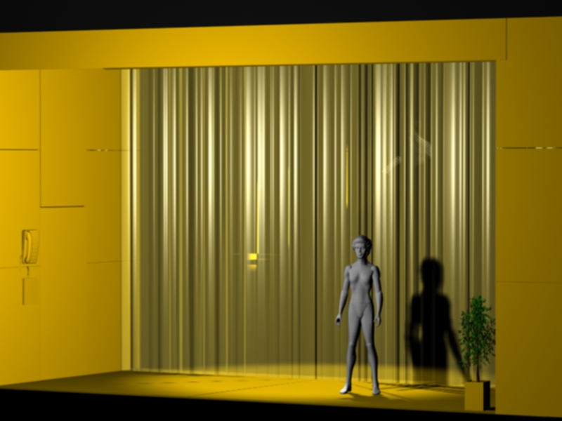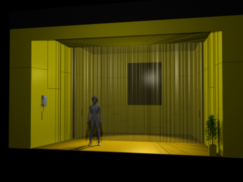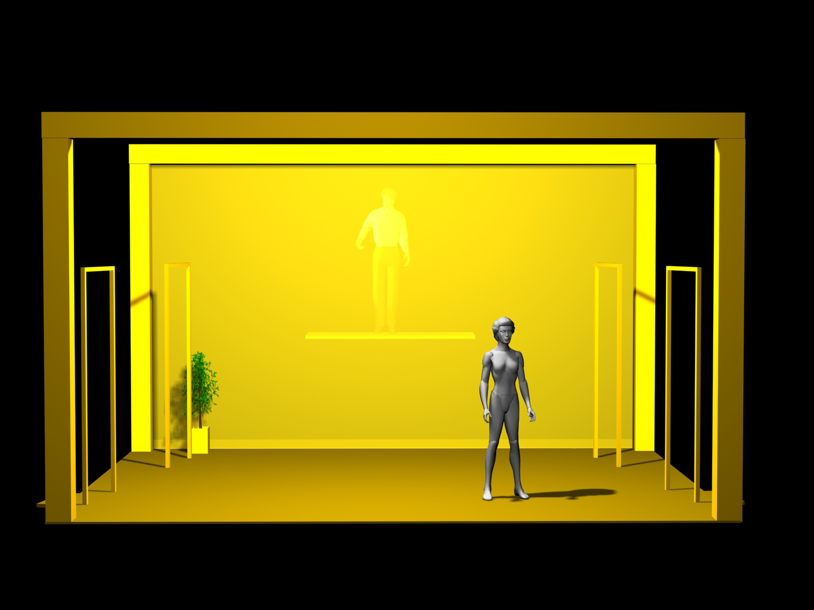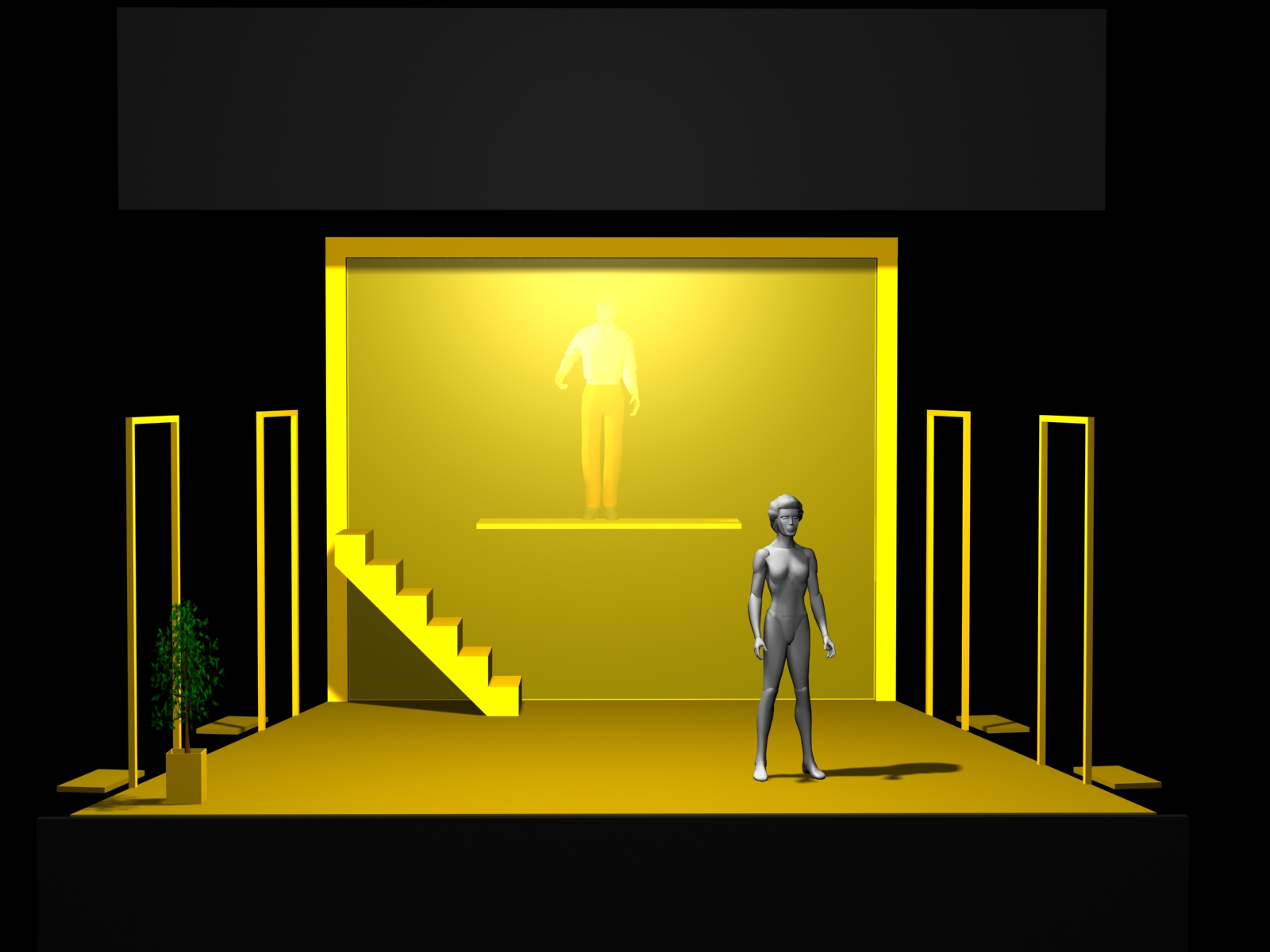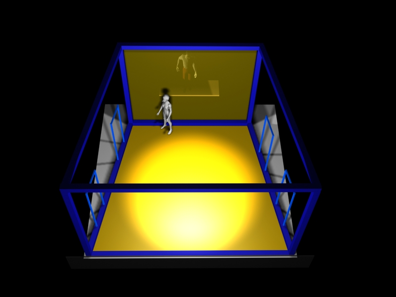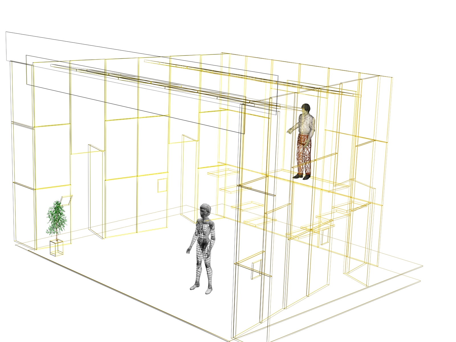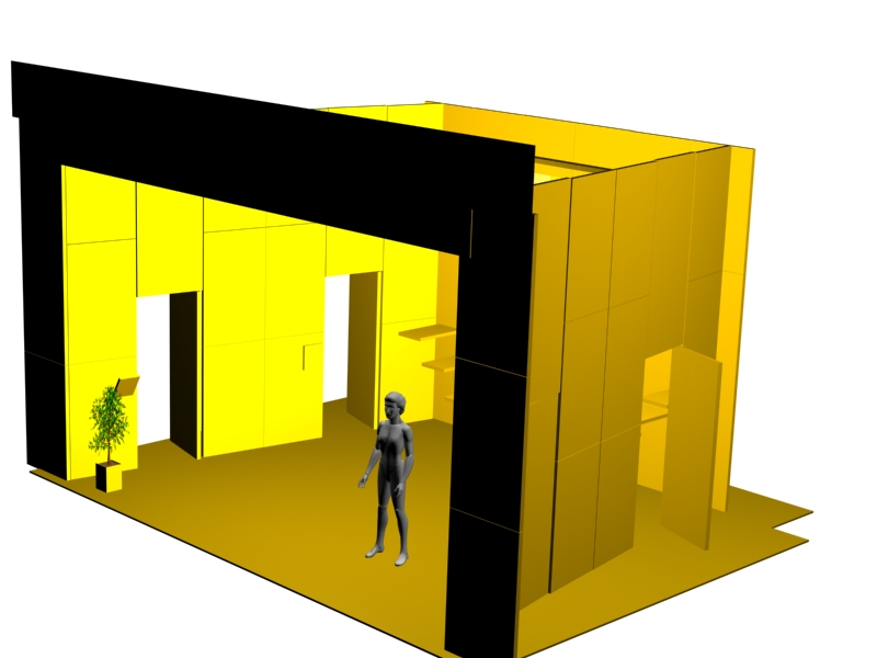La problématique était de concevoir une boite servant d'espace de jeu avec 4 portes ouvertes sur un univers propre à chaque personnage, la boite doit intégrer un musicien, qui accompagne les voix.