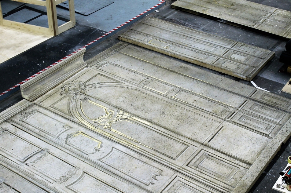 Les corniches sont réalisées en Styrodur, les moulures des châssis dans des feuilles de polystyrène travaillées en creux à l'acétone et dorées à la feuille d'or.