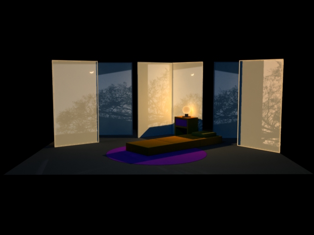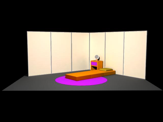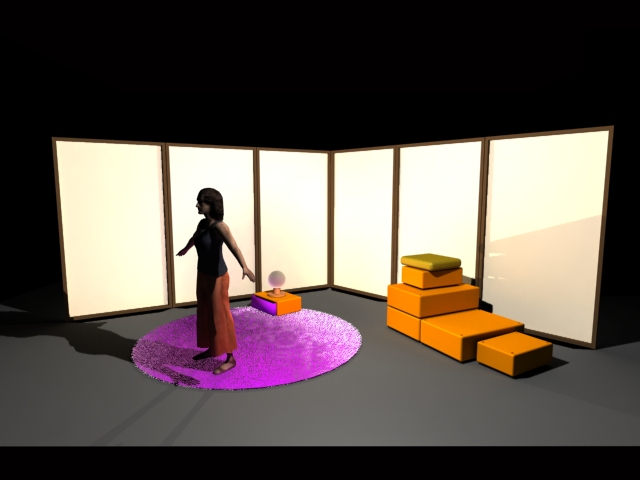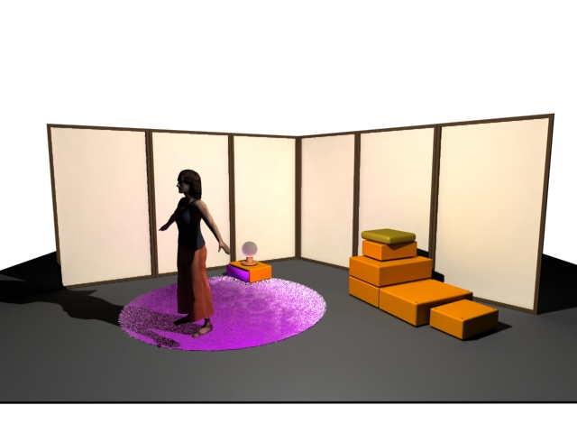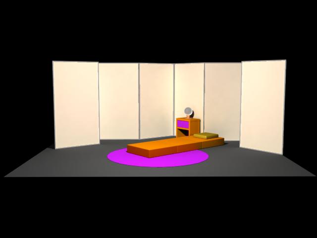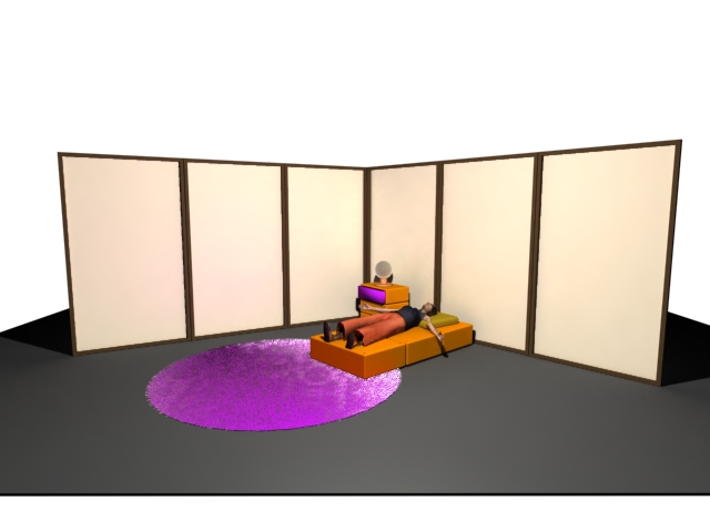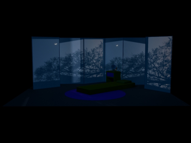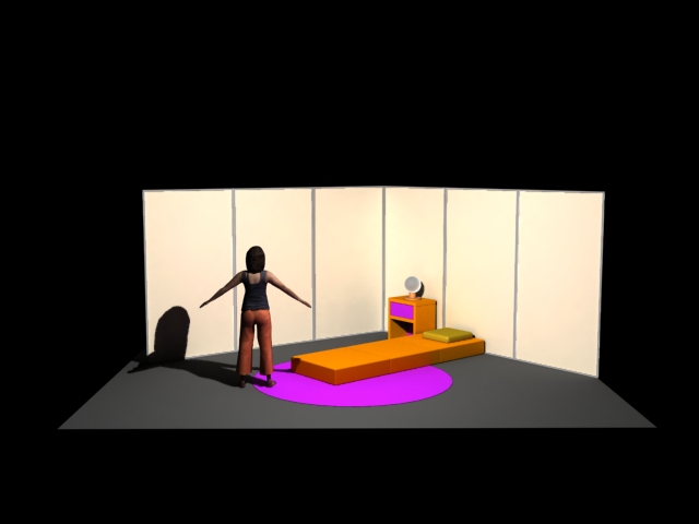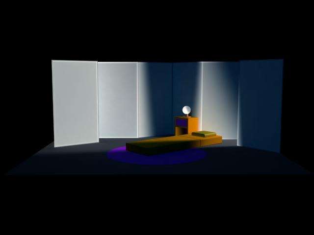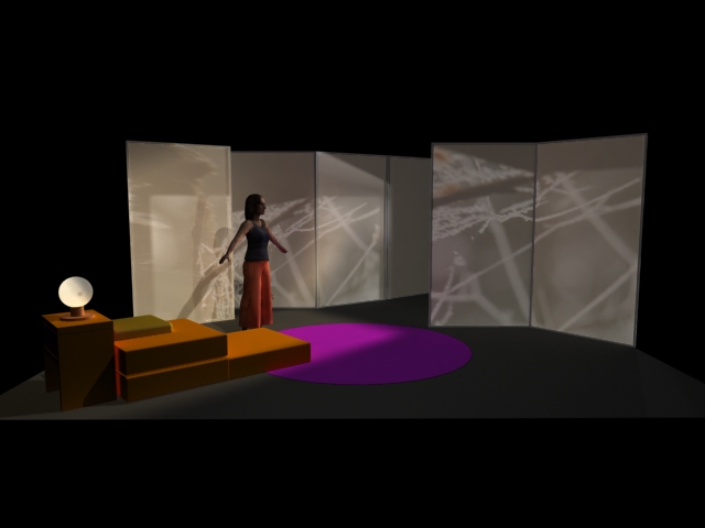 Un texte de Dominique Richard. Indiqué l'espace d'une chambre qui se transforme via l'imaginaire d'une enfant. Dispositif scéno-vidéo constitué de 6 panneaux mobiles. Rétroprojection.
