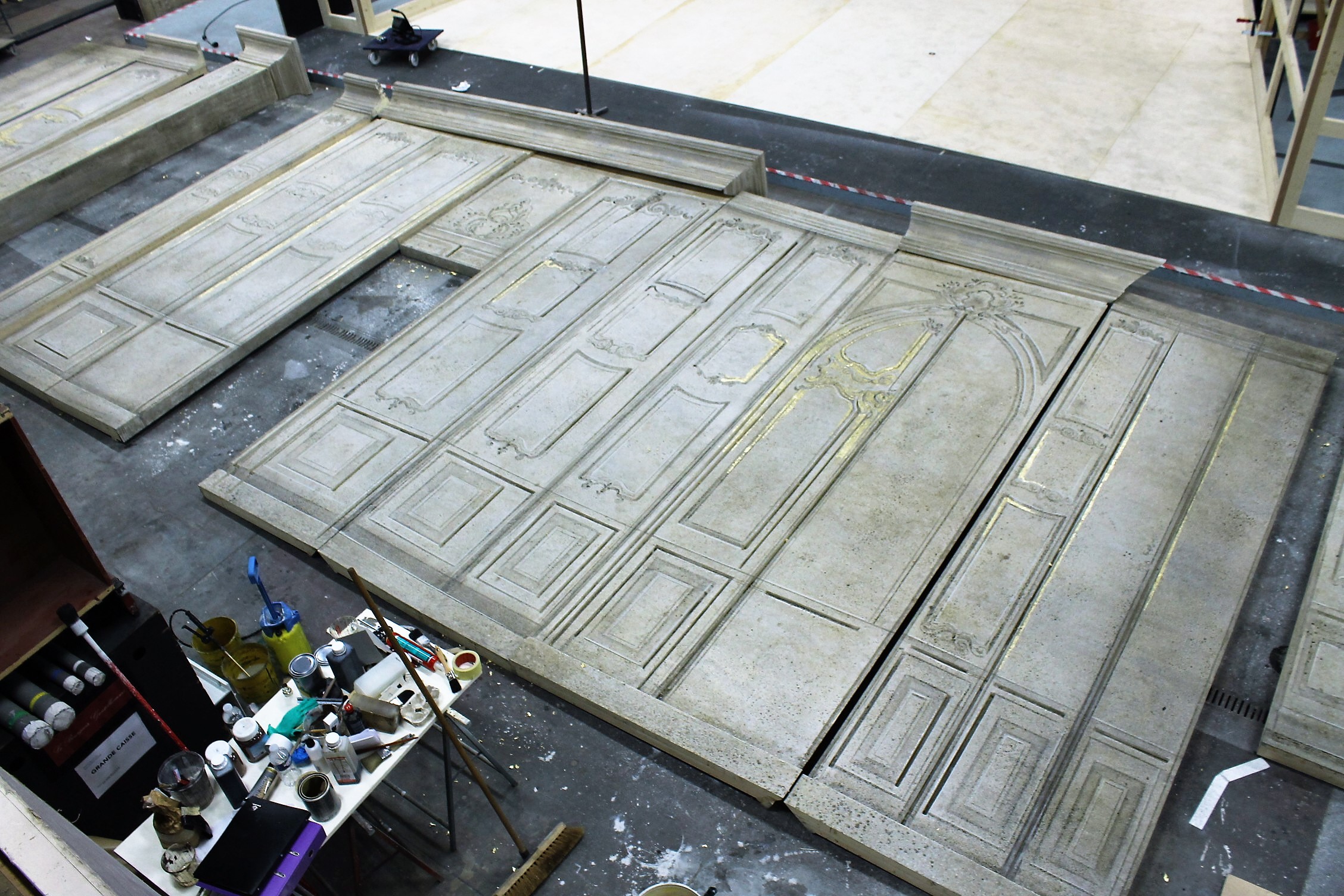 Les corniches sont réalisées en Styrodur, les moulures des châssis dans des feuilles de polystyrène travaillées en creux à l'acétone et dorées à la feuille d'or.