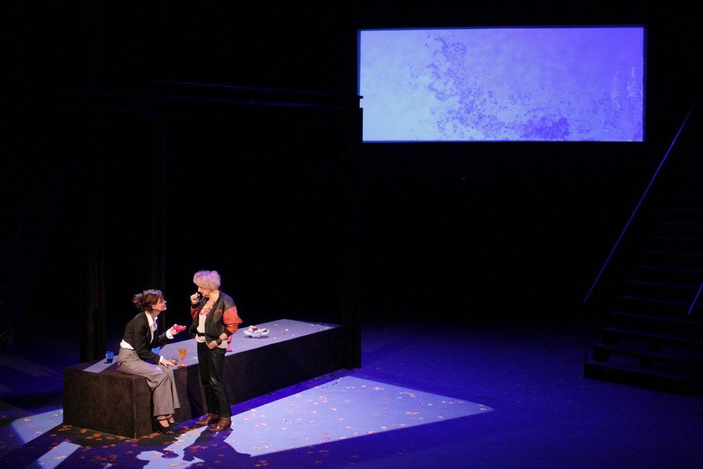 spectacle où l'image filmée alterne avec le jeu sur le plateau. Elle est comme la projection mentale d'un des deux personnages.